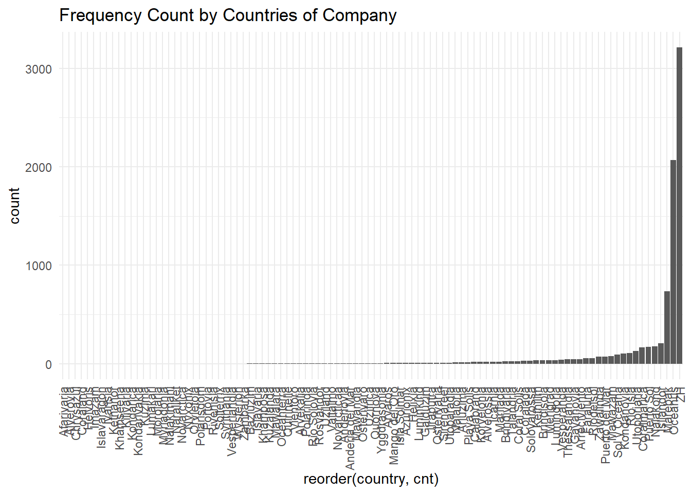 mc3_nodes %>%filter(type=='Company') %>%select(id, country) %>%distinct() %>%group_by(country) %>%mutate(cnt=n()) %>%ggplot(aes(x=reorder(country, cnt)))+geom_bar()+theme_minimal()+ggtitle('Frequency Count by Countries of Company')+theme(axis.text.x =element_text(angle =90, vjust =0.5, hjust=1))