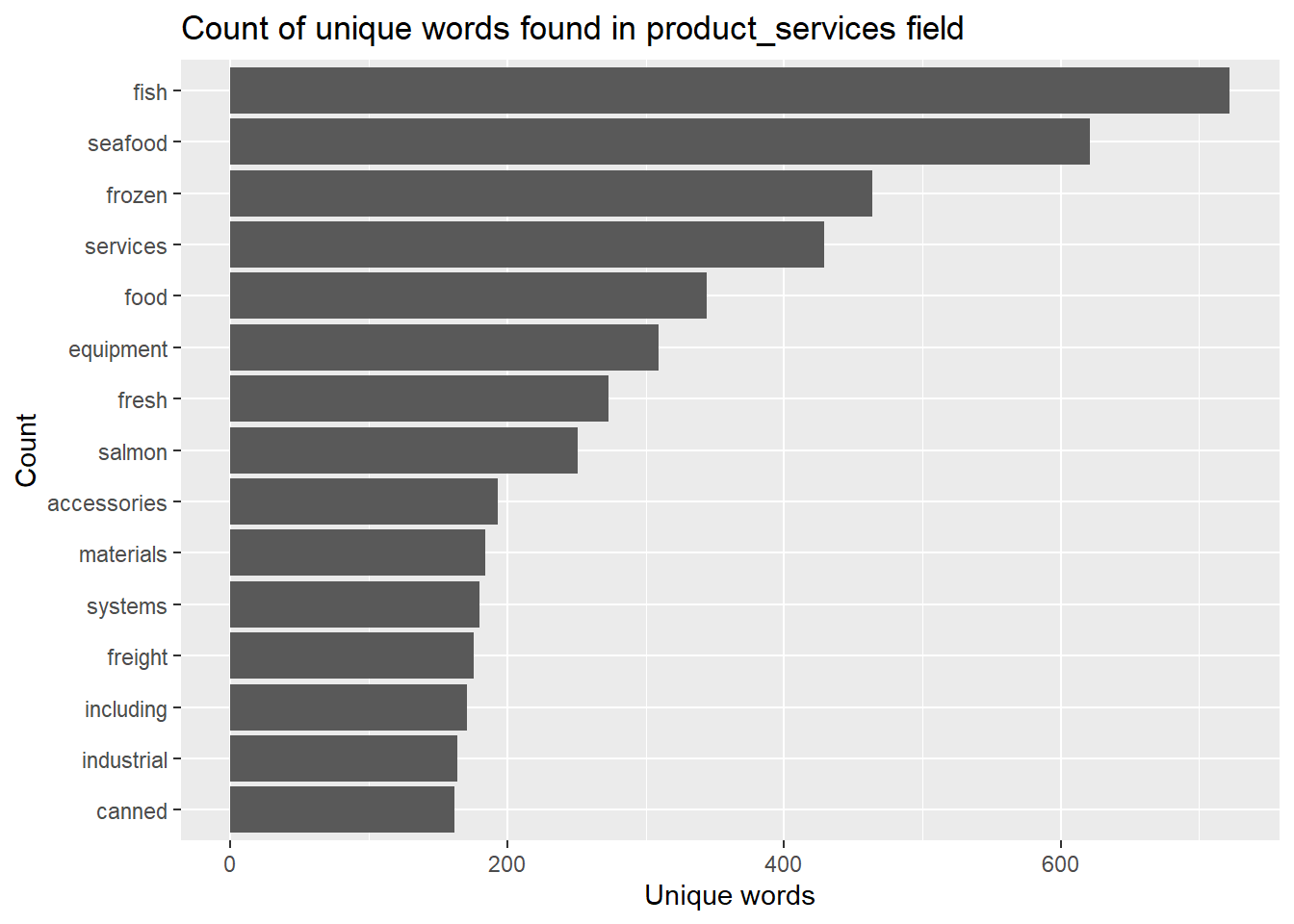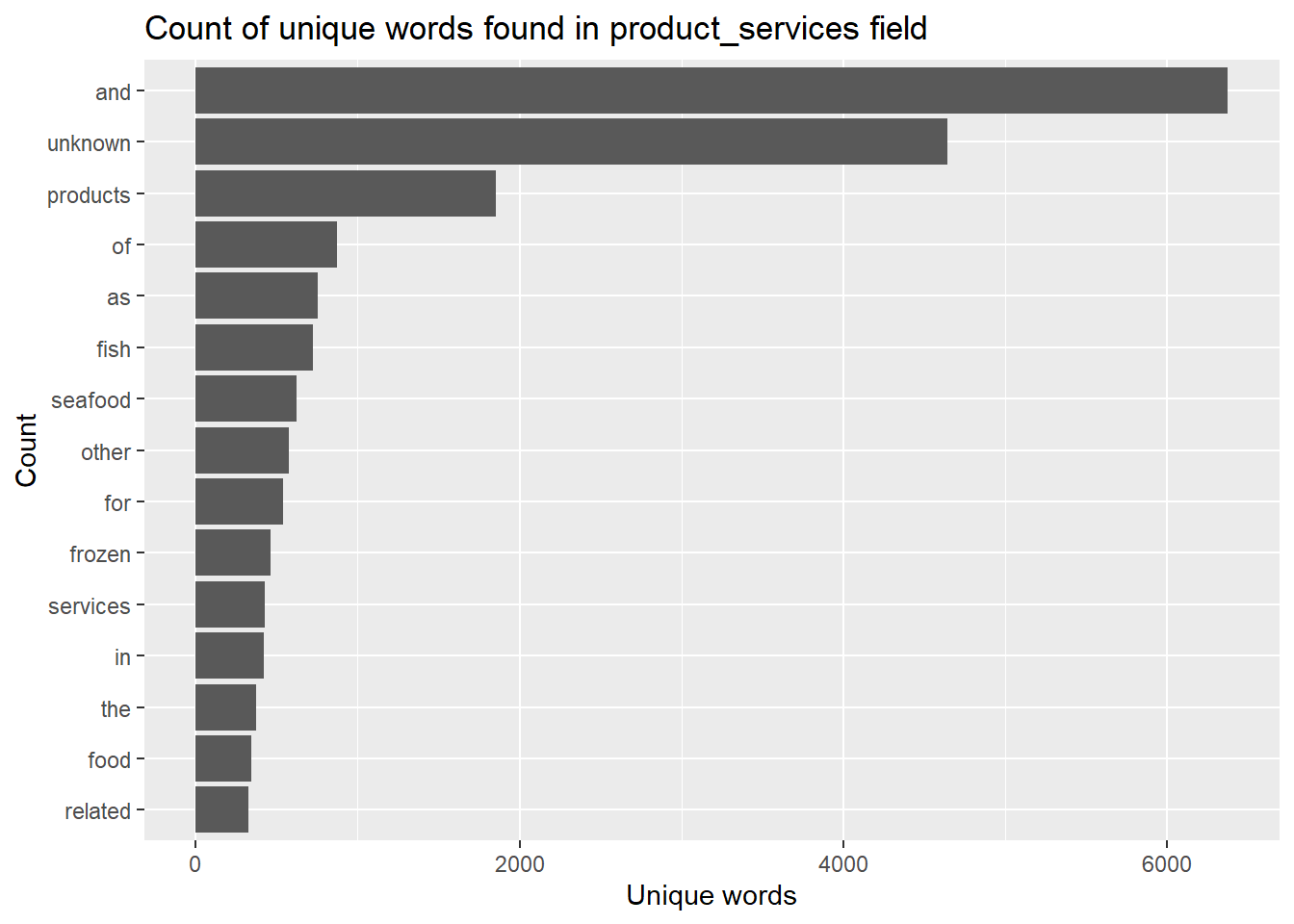 token_nodes %>%count(word, sort =TRUE) %>%top_n(15) %>%mutate(word =reorder(word, n)) %>%ggplot(aes(x = word, y = n)) +geom_col() +xlab(NULL) +coord_flip() +labs(x ="Count",y ="Unique words",title ="Count of unique words found in product_services field")