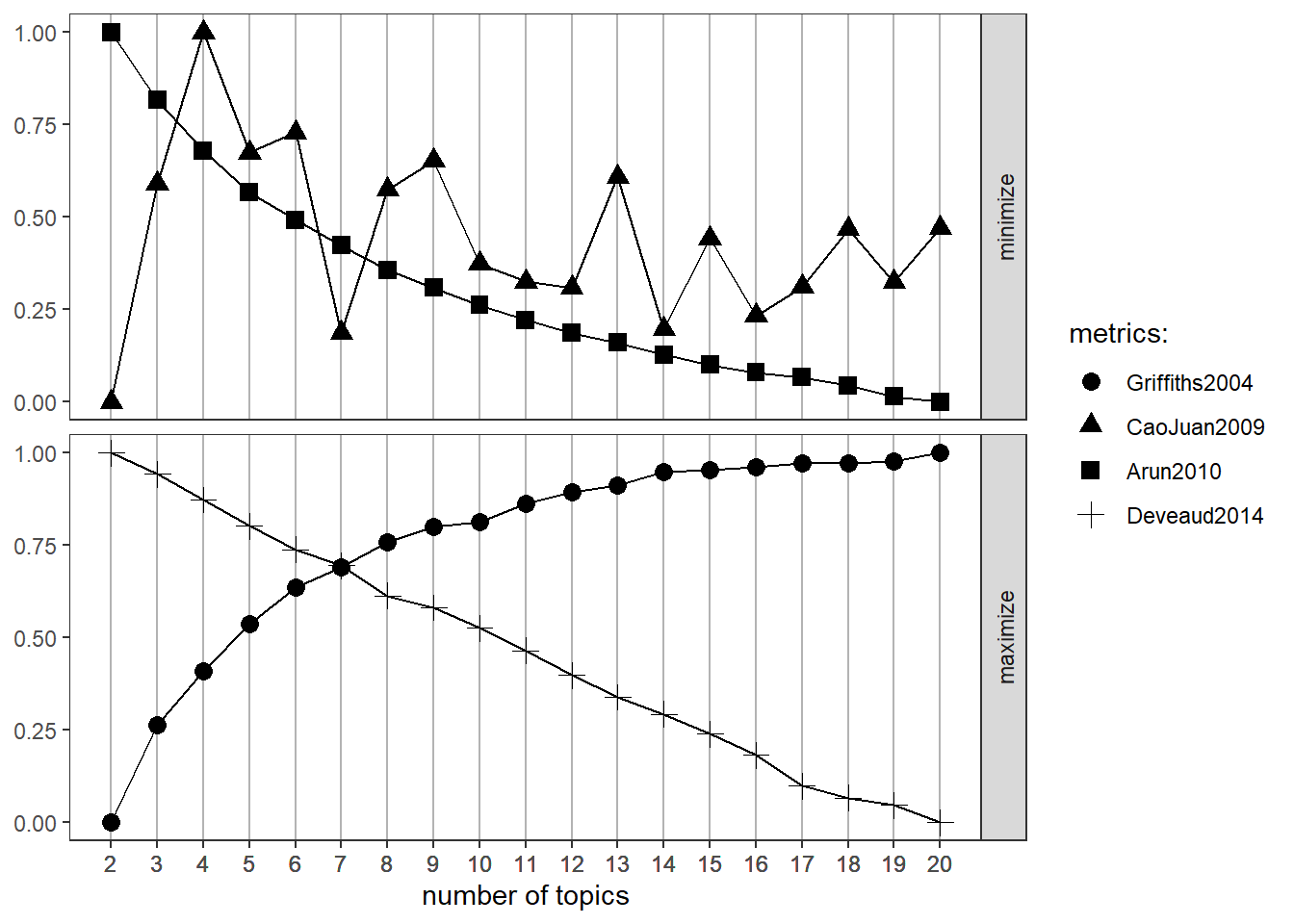 To facilitate easy analysis of the outcomes, the FindTopicsNumber_plot support function can be utilized.