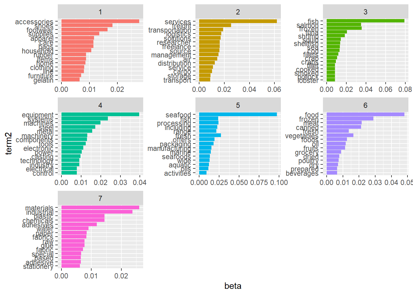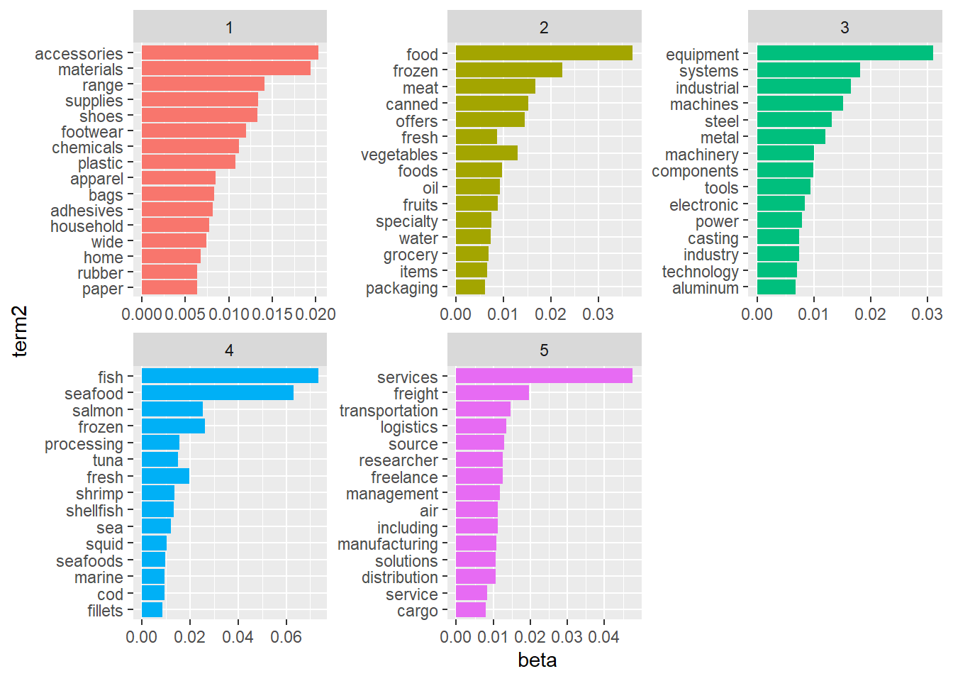 # Assign topic with the highest gamma score to the document/companycp_map<-lda_topics %>%group_by(document) %>%summarise(gamma=max(gamma)) cp_map<-cp_map %>%left_join(lda_topics) %>%mutate(topic=recode(topic, '1'="accessories_materials",'2'="food",'3'="equipment",'4'="fish_seafood",'5'="services")) %>%rename("Industry"="topic") %>%select(document, Industry)# Use left join to join back to company revenue infocompany<-company %>%left_join(cp_map, by=c("id"="document"))# Drop those company with unknown industrycompany<- company %>%drop_na(Industry) %>%drop_na(revenue)