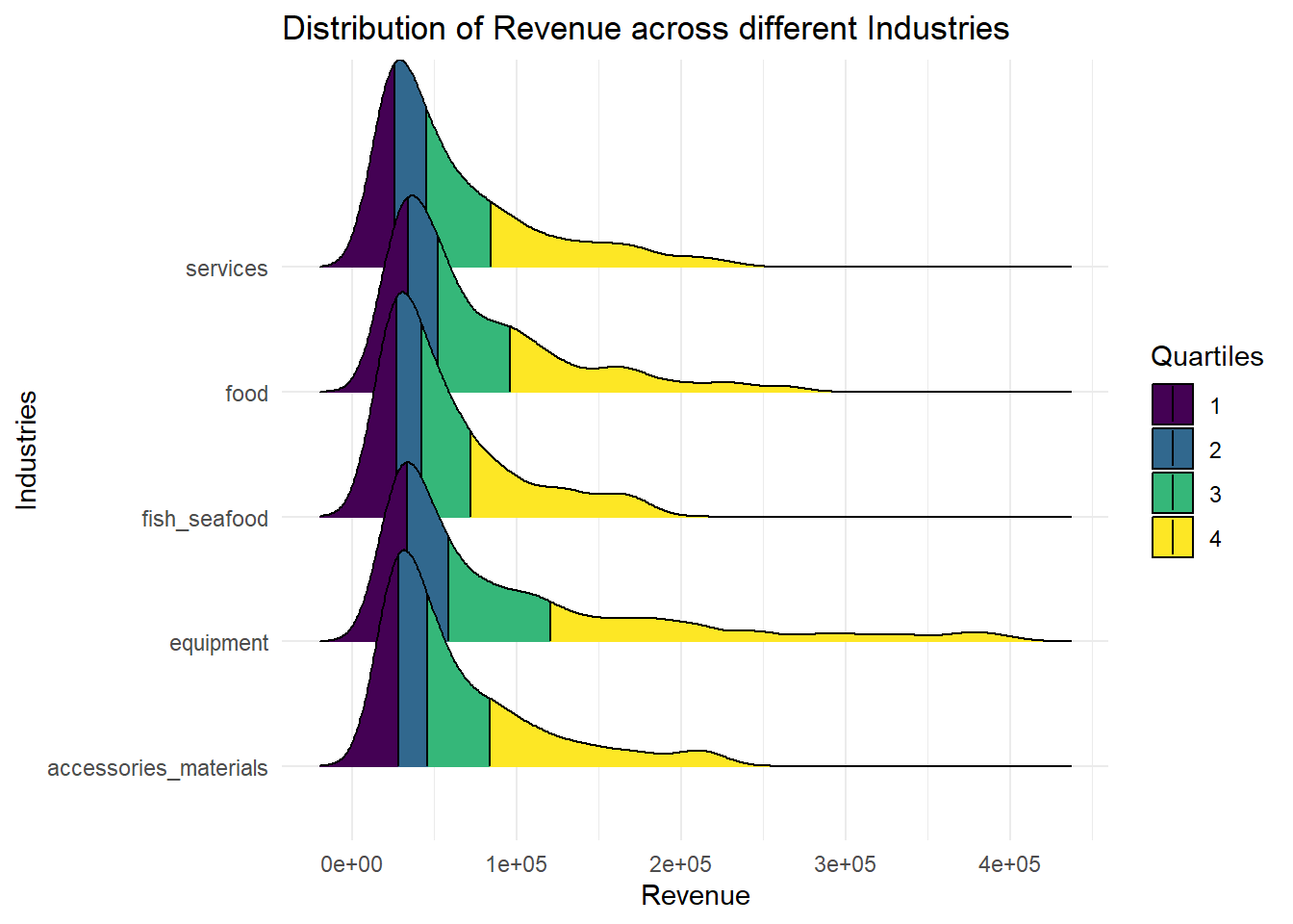 company_rmo %>%ggplot(aes(x = revenue, y = Industry,fill=factor(after_stat(quantile)) )) +stat_density_ridges(geom ="density_ridges_gradient",calc_ecdf =TRUE, quantiles =4,quantile_lines =TRUE) +scale_fill_viridis_d(name ="Quartiles") +theme_ridges()+ggtitle("Distribution of Revenue across different Industries")+theme_minimal()+ylab("Industries")+xlab("Revenue")