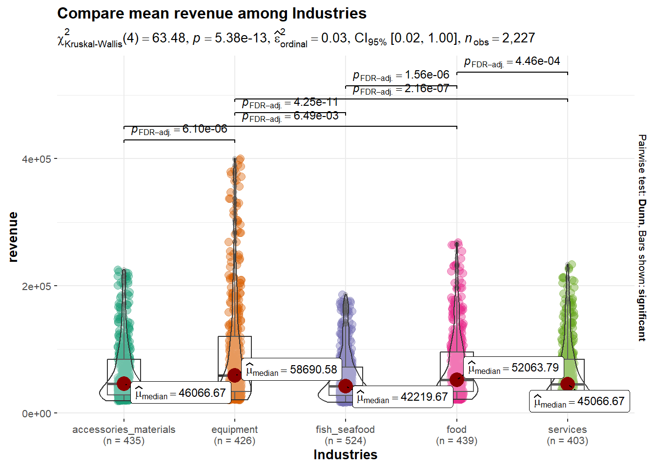 ggbetweenstats(data = company_rmo,x = Industry, y = revenue,type ="np",mean.ci =TRUE, pairwise.comparisons =TRUE, pairwise.display ="s",p.adjust.method ="fdr",messages =FALSE) +ggtitle("Compare mean revenue among Industries")+xlab("Industries")